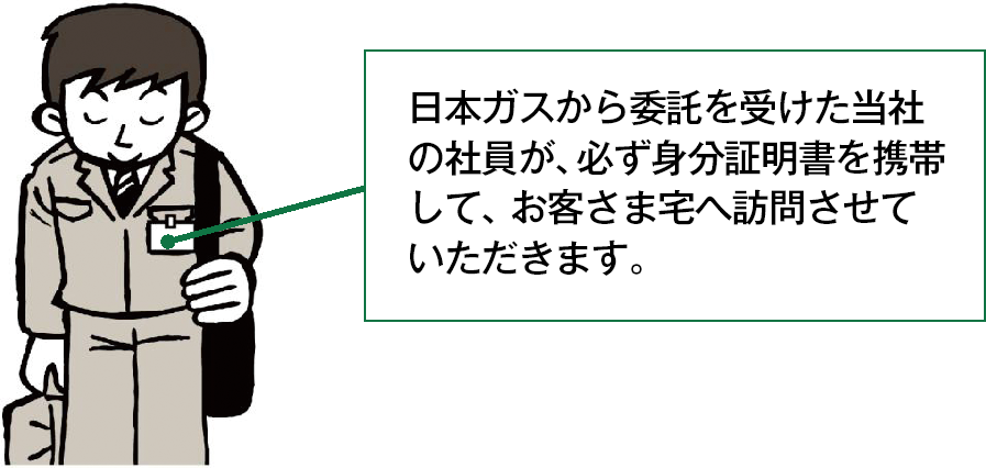 ガス定期保安調査にお伺いする際、日本ガスから委託を受けた当社の社員が事前にお知らせ表をお届けした上でお客さま宅を訪問させていただいております。